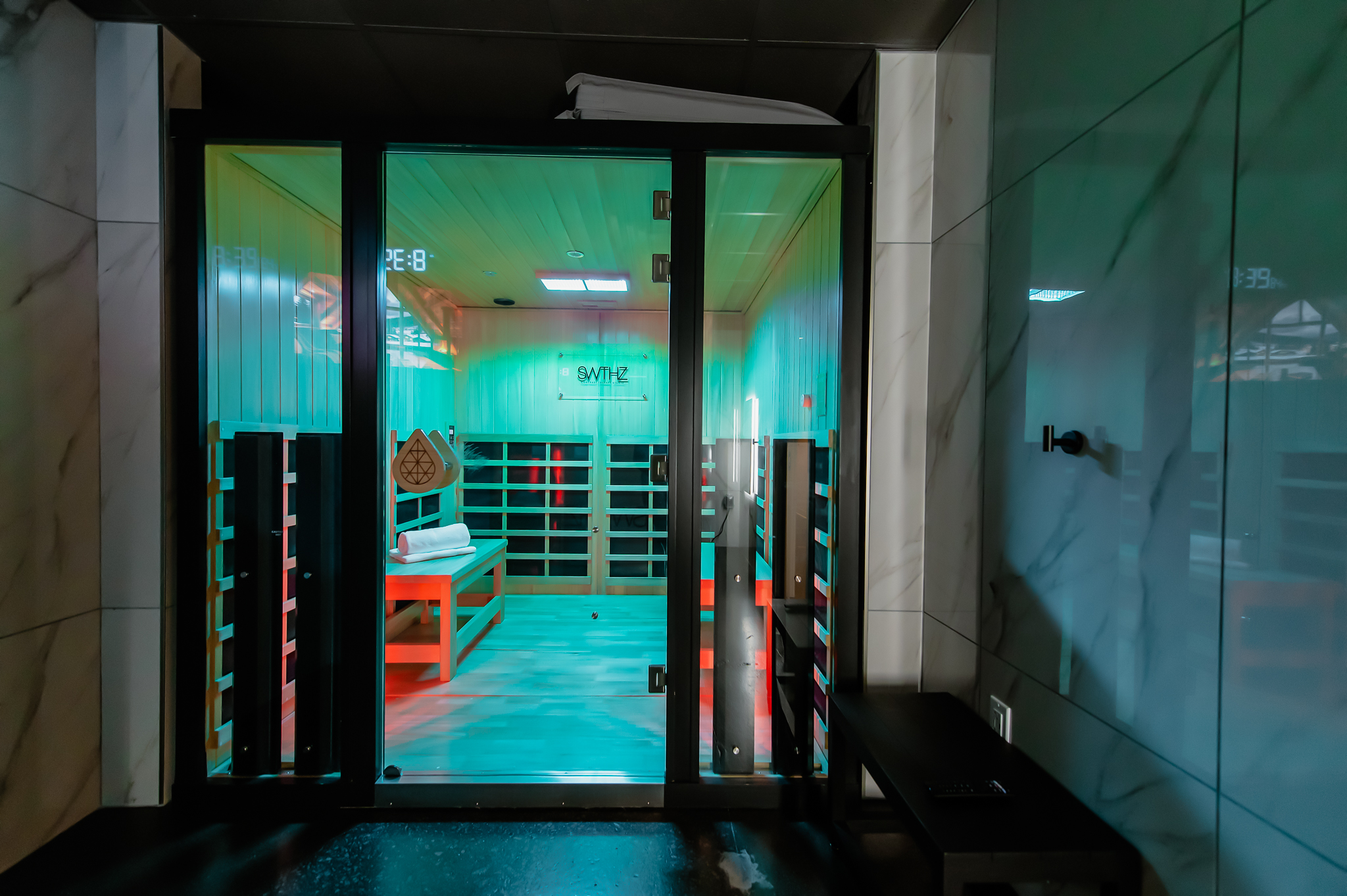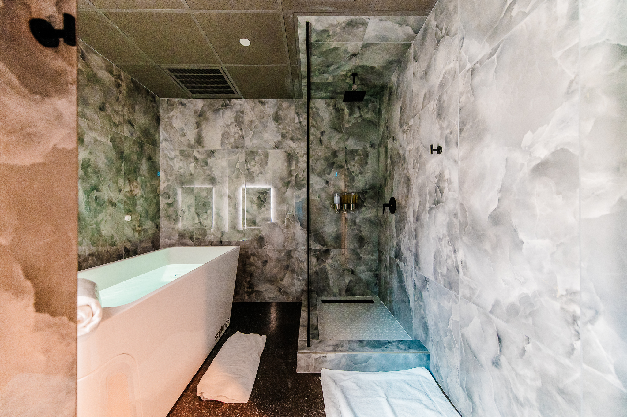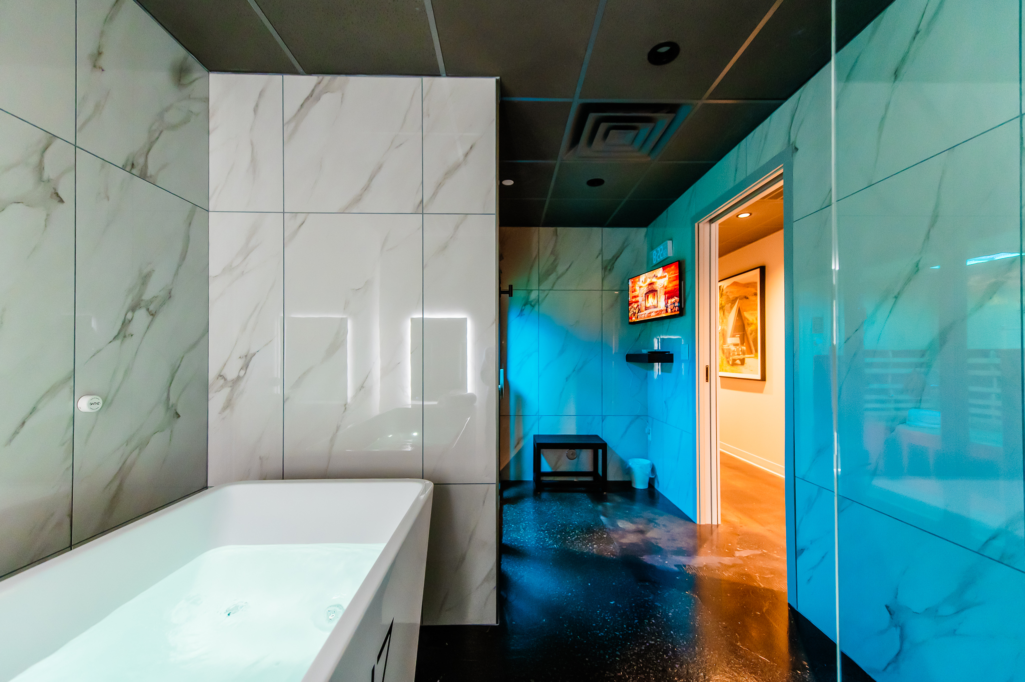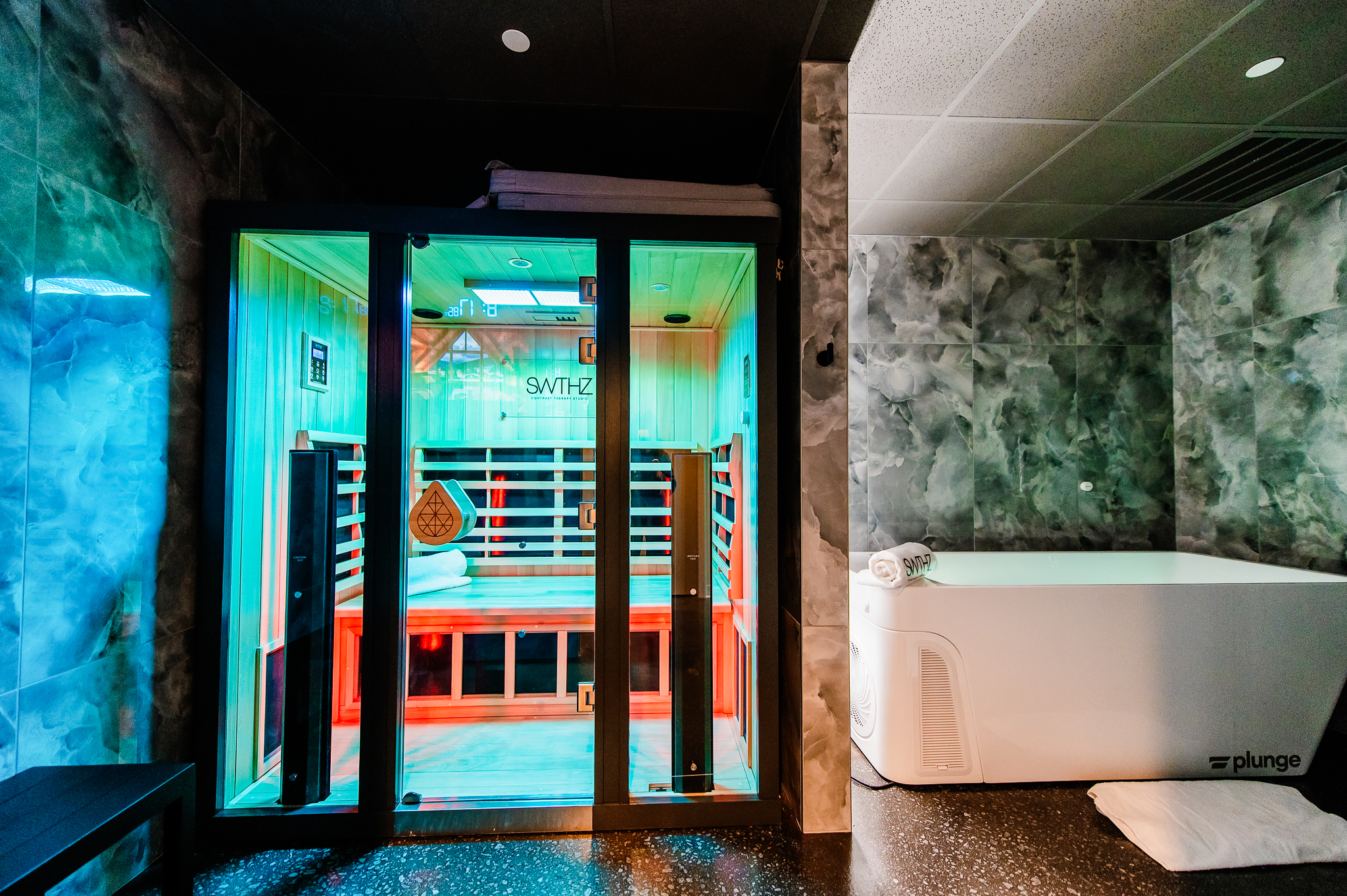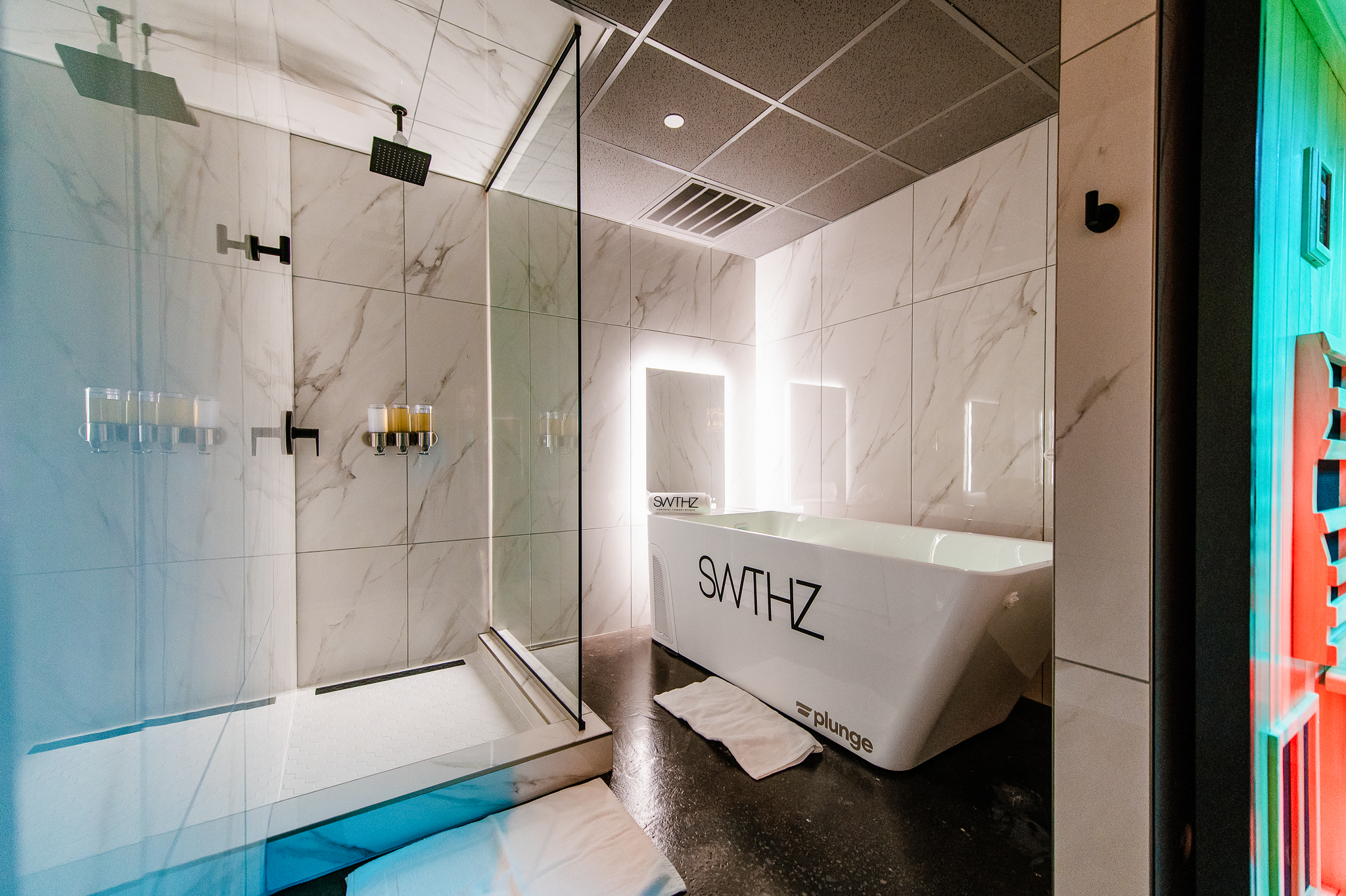 Renovation of existing occupied tenant suite into a new contrast therapy clinic. Project includes 9 contrast therapy suites which include cold plunges, saunas and showers in each suite as well as lobby/reception and client private space.